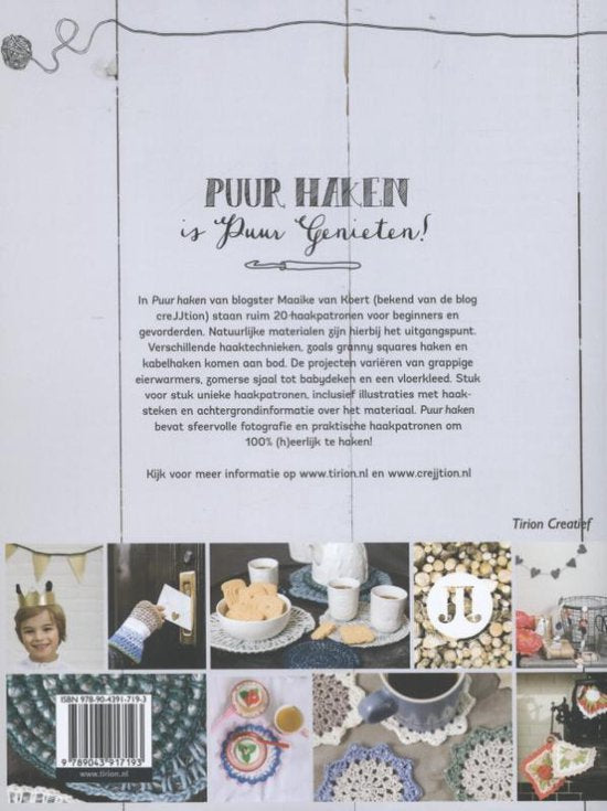 In Puur haken van blogster Maaike van Koert (bekend van de blog creJJtion) staan ruim 20 haakpatronen voor beginners en gevorderden. Duurzame materialen zijn hierbij het uitgangspunt. Van grappige eierwarmers, zomerse sjaal tot babydeken en veel verschillende granny squares. Maaike van Koert laat unieke haakpatronen zien, inclusief illustraties met haaksteken en achtergrondinformatie over het materiaal. Puur haken bevat sfeervolle fotografie en praktische haakpatronen om 100% (h)eerlijk te haken!